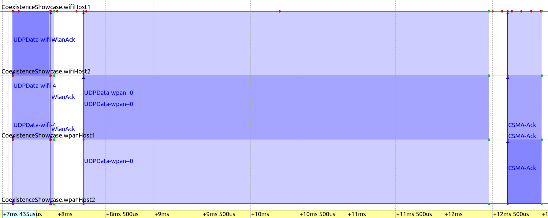 In reality and INET, both 802.11 and 802.15.4 employ the Clear Channel Assessment (CCA) technique (they listen to the channel to make sure there are no ongoing transmissions before starting to transmit) and defer from transmitting for the duration of a backoff period when the channel is busy. The use of CCA and backoff enables the two technologies to coexist cooperatively (both of them can communicate successfully), as opposed to destructively (they ruin each other’s communication). In our case, the nodes of the different technologies sense when the other kind is transmitting, and tend not to interrupt each other.